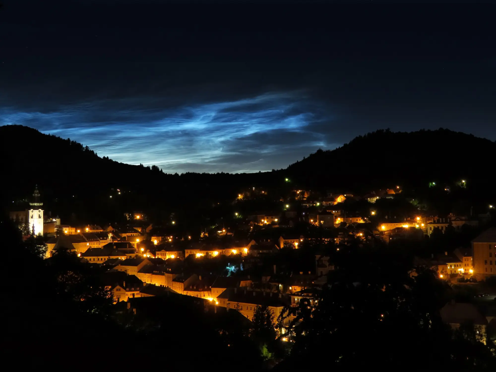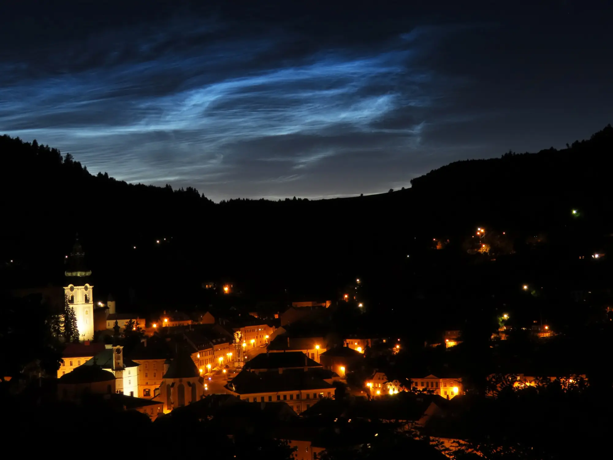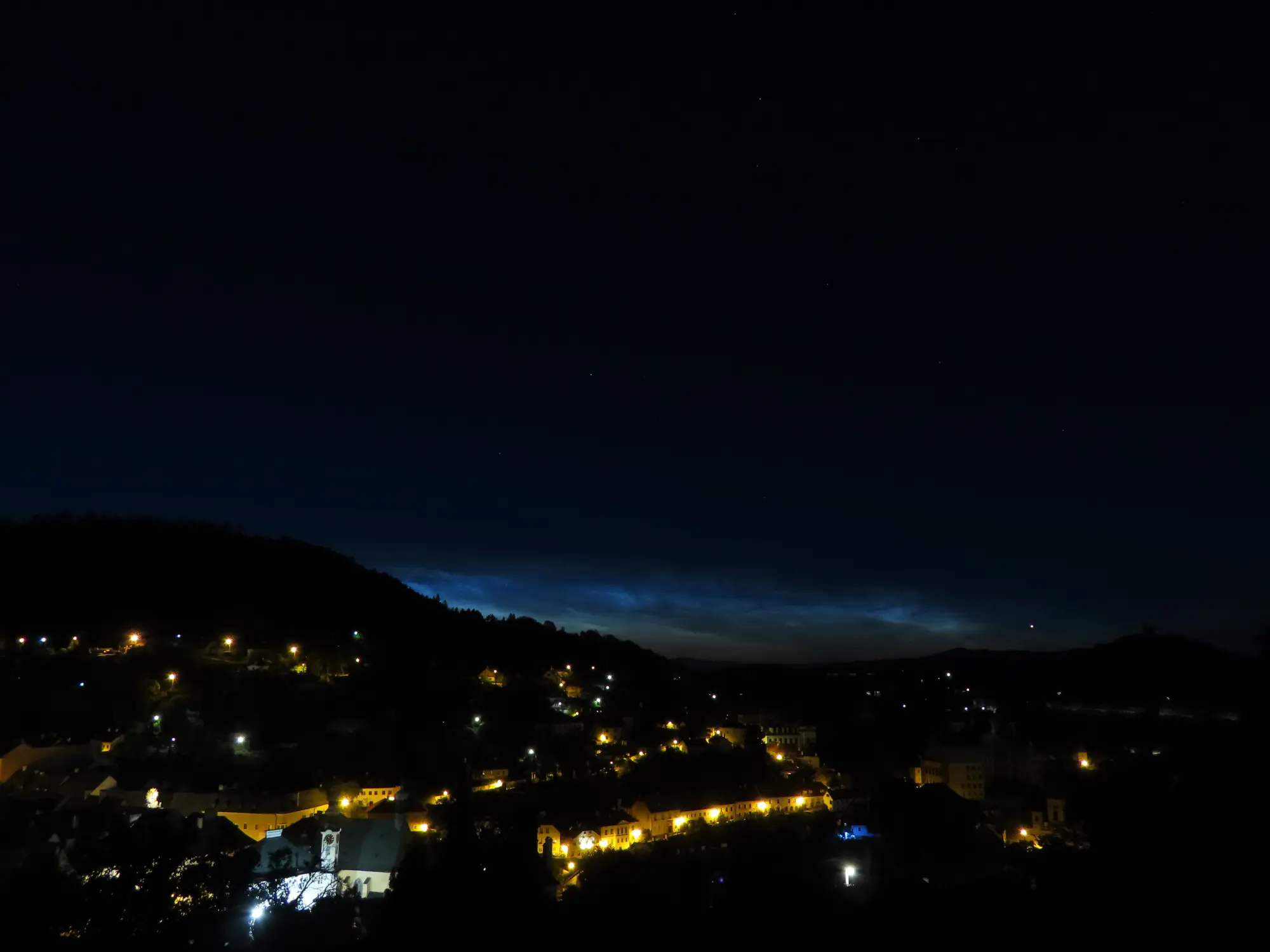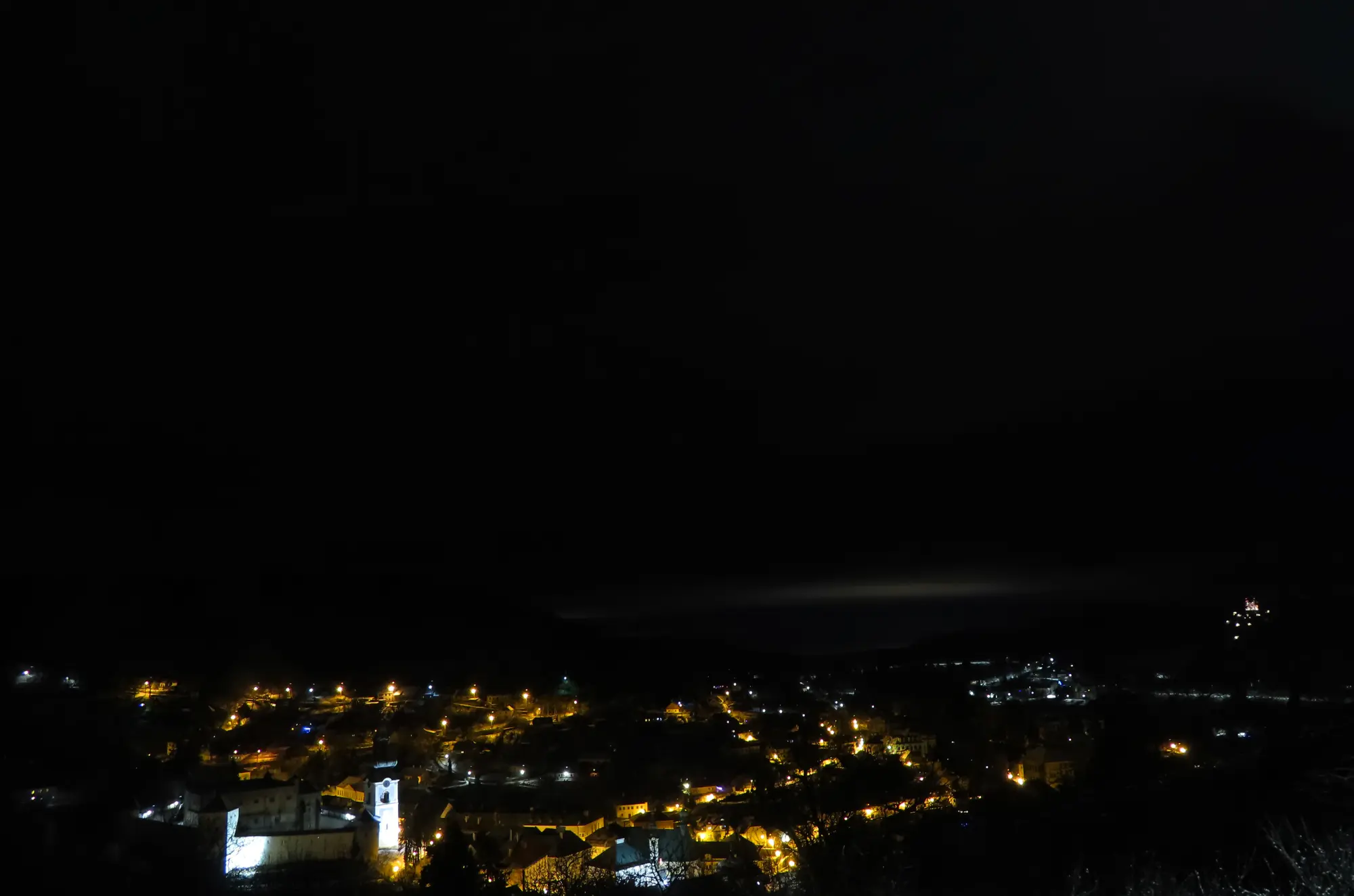 Nočná Štiavnica. Svetelný oblak v pozadí je svetelný smog zo Zvolena