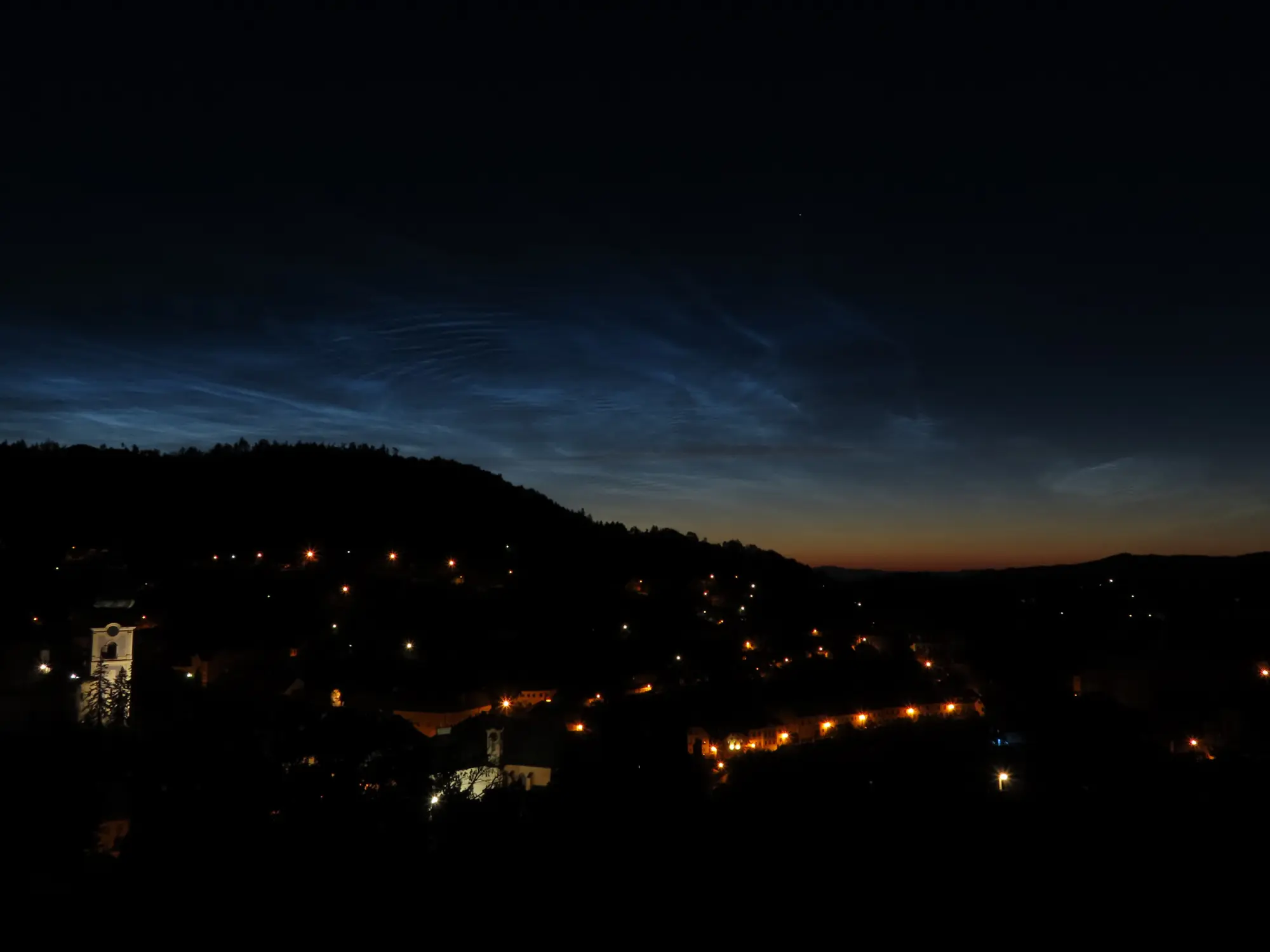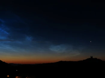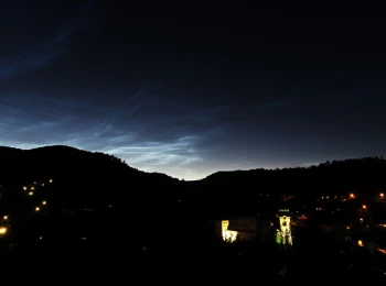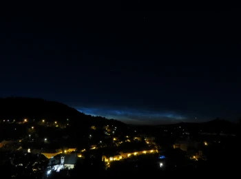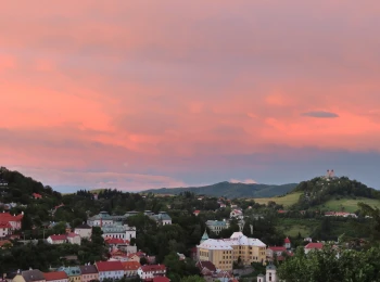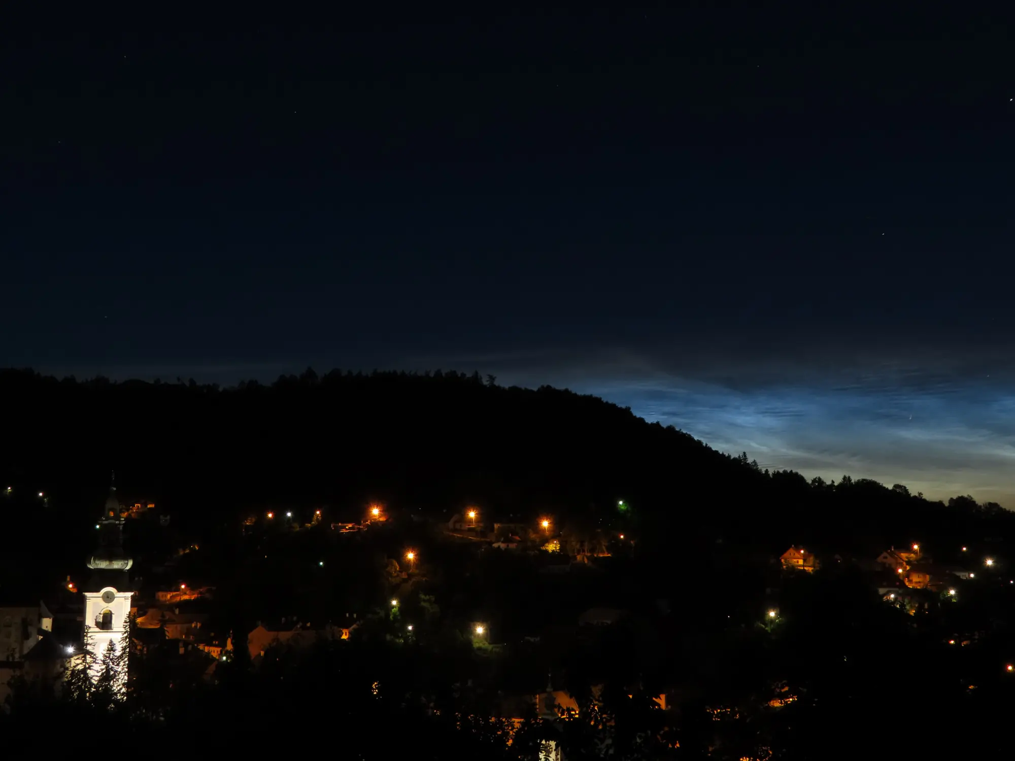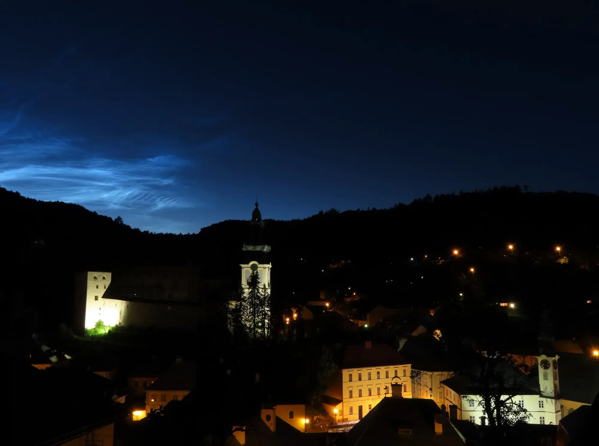 Nočná Štiavnica. Svetelný oblak v pozadí je svetelný smog zo Zvolena